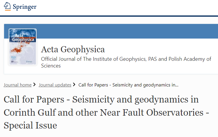 The Acta Geophysica (Springer) Special Issue is inviting papers for the theme ”Seismicity and geodynamics in Corinth Gulf and other Near Fault Observatories”.