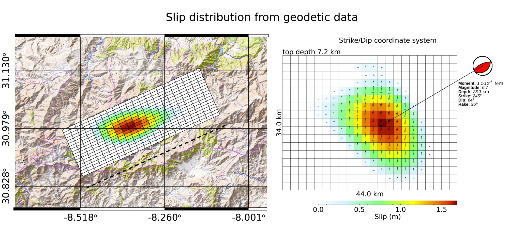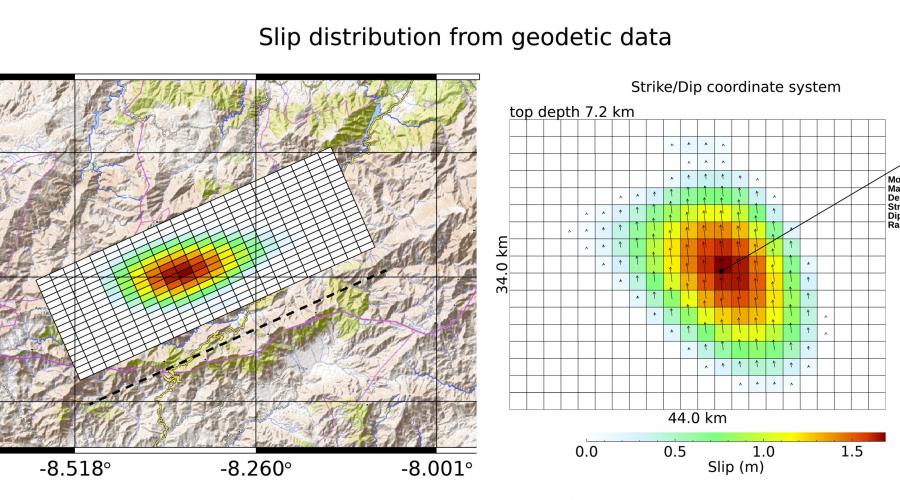 By applying the Synthetic Aperture Radar Interferometry (InSAR) technique to data acquired by the European Sentinel-1A satellite across the event, the system automatically generates a map of the surface displacement induced by the earthquake [2]. The map, presented in Figure 1, shows that the ground experienced a maximum displacement of about 18 cm along the satellite Line-of-Sight (LOS) and a minimum of about -5 cm. This research product is immediately shared with the scientific community through the EPOS Data Portal [3] for further analysis, while being further processed by the system to retrieve also information about the seismic source that originates the earthquake, that resulted to be a North dipping fault with an inverse mechanism and a maximum slip of about 1.7 m, as shown in Figure 2. Seismic source products are presently available at this link [4] and are going to be soon integrated within the TCS-SATD data product portfolio.