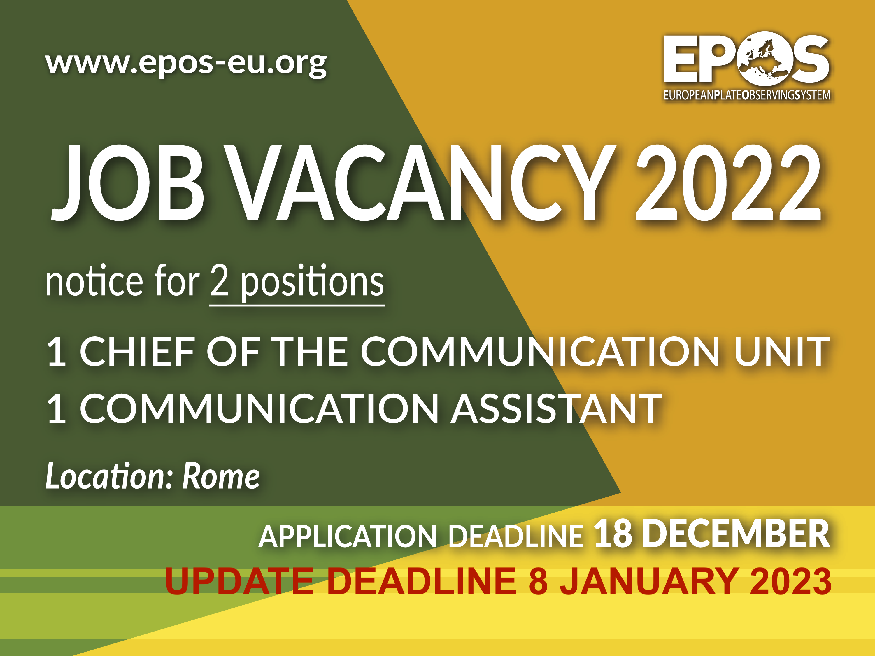 EPOS ERIC is looking for two motivated persons to cover the roles of Chief (Profile A) and Assistant (profile B) for the Communication Unit. The successful candidates will be responsible for developing and implementing EPOS’s internal and external communication activities by improving the communication strategy and ensuring the impact of the communication activities.