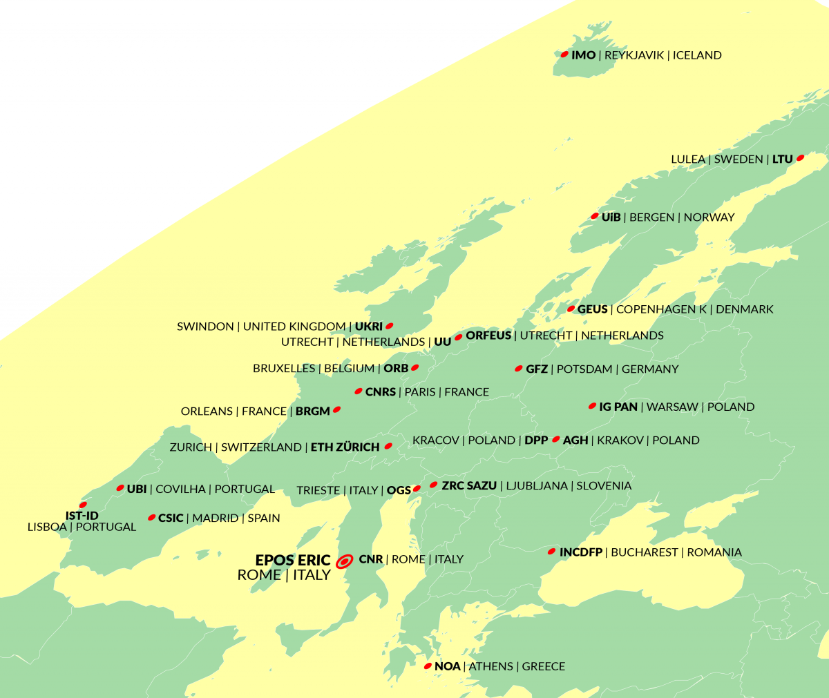 24 Beneficiaries: EPOS ERIC - UKRI - BRGM - IG PAS - ETH Zurich - UiB - CNRS - UBI - ORB - CNR - ZRC SAZU - LTU - GEUS - GFZ - CSIC - IMO - NOA - UU - INCDFP - IST-ID - DPP - AGH - OGS and the international organization ORFEUS